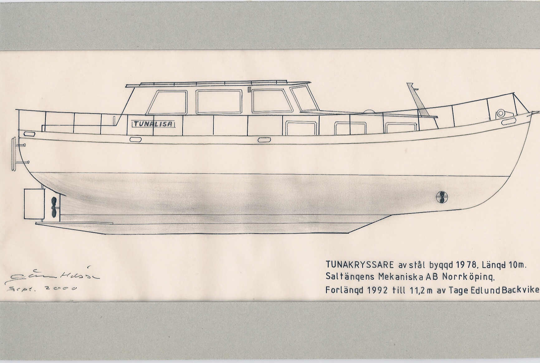 Båten är beställd skrovfärdig utan akterruff av Tage Edlund. Han har sedan inrett båten samt byggt en självlänsande sittbrunn. Båten är förlängd 4 fot (1,20m) 1992 av Tage Edlund. Inredningen i styrhytt byggdes då om. Förlängningen blev mycket lyckad.