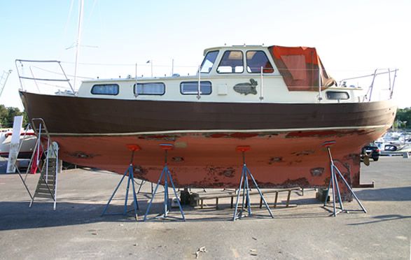I skrivande stund står Sabine på land för en ordentlig genomgång och upprustning. Vi tog upp den ur sjön den 1 maj och hoppas lägga i igen före midsommar. Båten har legat i sjön i 5 år, men klarat sig väldigt bra ändå. Lite havstulpaner och en del ytrost i vatttenlinjen, men ingenting farligt. Listan på vad som ska göras är lång. Naturligtvis skrapning, viss blästring och målning, såväl under som över vattenlinjen och nya zinkanoder. Båten har haft vinröd, svart och nu senast Havannabrun bordläggning. Nu kommer den att bli marinblå med vit vattenlinje.